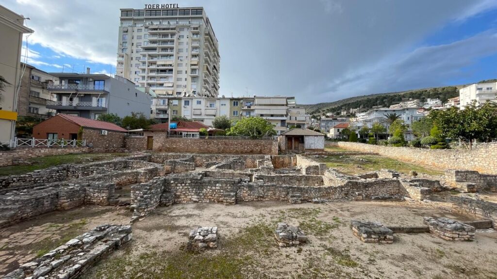 Në plan të parë shtrihen rrënojat e Bazilikës së Onhezmit, ndërsa në sfond ngrihen ndërtesat moderne të qytetit, duke krijuar një kontrast të fortë mes historisë dhe zhvillimit të sotëm. Në këtë hapësirë, bazilika vijon të qëndrojë si një dëshmi e rëndësishme e identitetit historik të Sarandës, duke ruajtur gjurmët e një qyteti që ka ekzistuar dhe evoluar ndër shekuj.