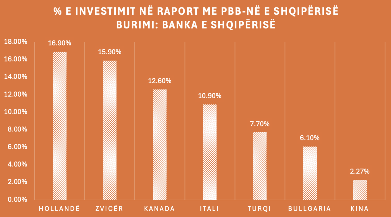 Sot Kina është ende faktor i vogël në ekonominë shqiptare. Holanda vijon të mbetet vendi me më shumë investime në Shqipëri, e ndjekur nga Zvicra, Kanadaja, Italia, Turqia dhe Bullgaria.