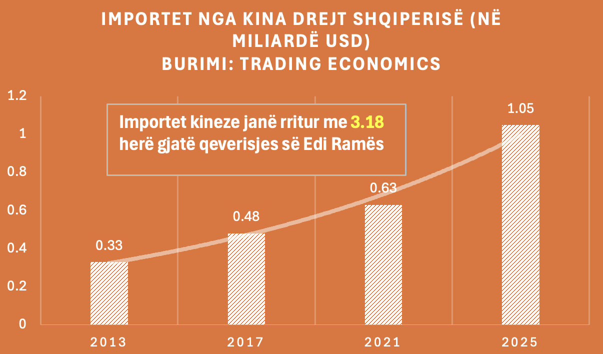 Kjo e fundit vërtetohet edhe nga fakti që gjatë 12 viteve të qeverisjes së Ramës, importet kineze në Shqipëri janë rritur me 3.18 herë, ndërsa investimet e huaja kineze përbëjnë 2.27% të ekonomisë shqiptare.
