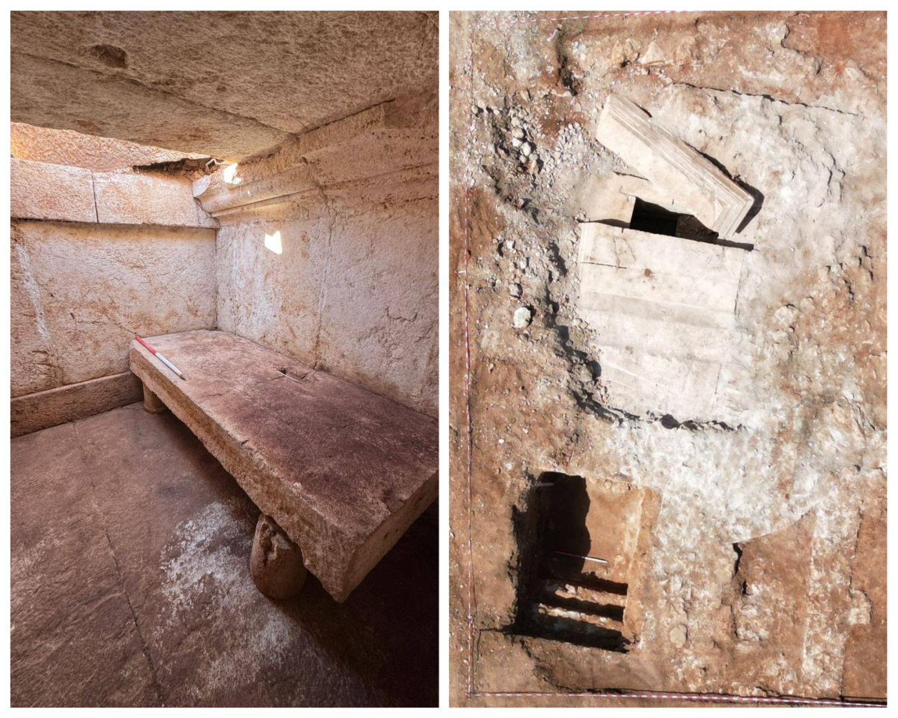 Sipas të dhënave të publikuara, varri i zbuluar më 1 shtator ka plan rreth 9×6 metra, dhomë funerare ~2.4 m të lartë, inventar luksi (ena qelqi, armë, objekte kocke, fragmente tekstili me fije ari) dhe një mbishkrim dygjuhësh kushtuar Jupiterit që përmend një individ të pasur, Gelliano.