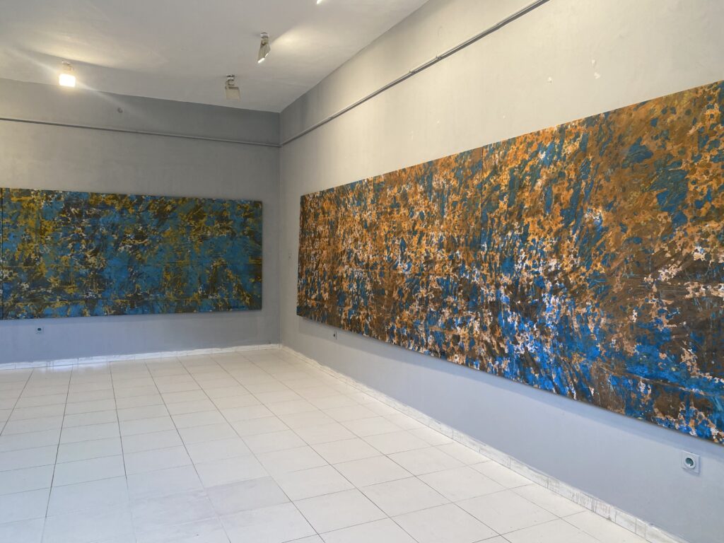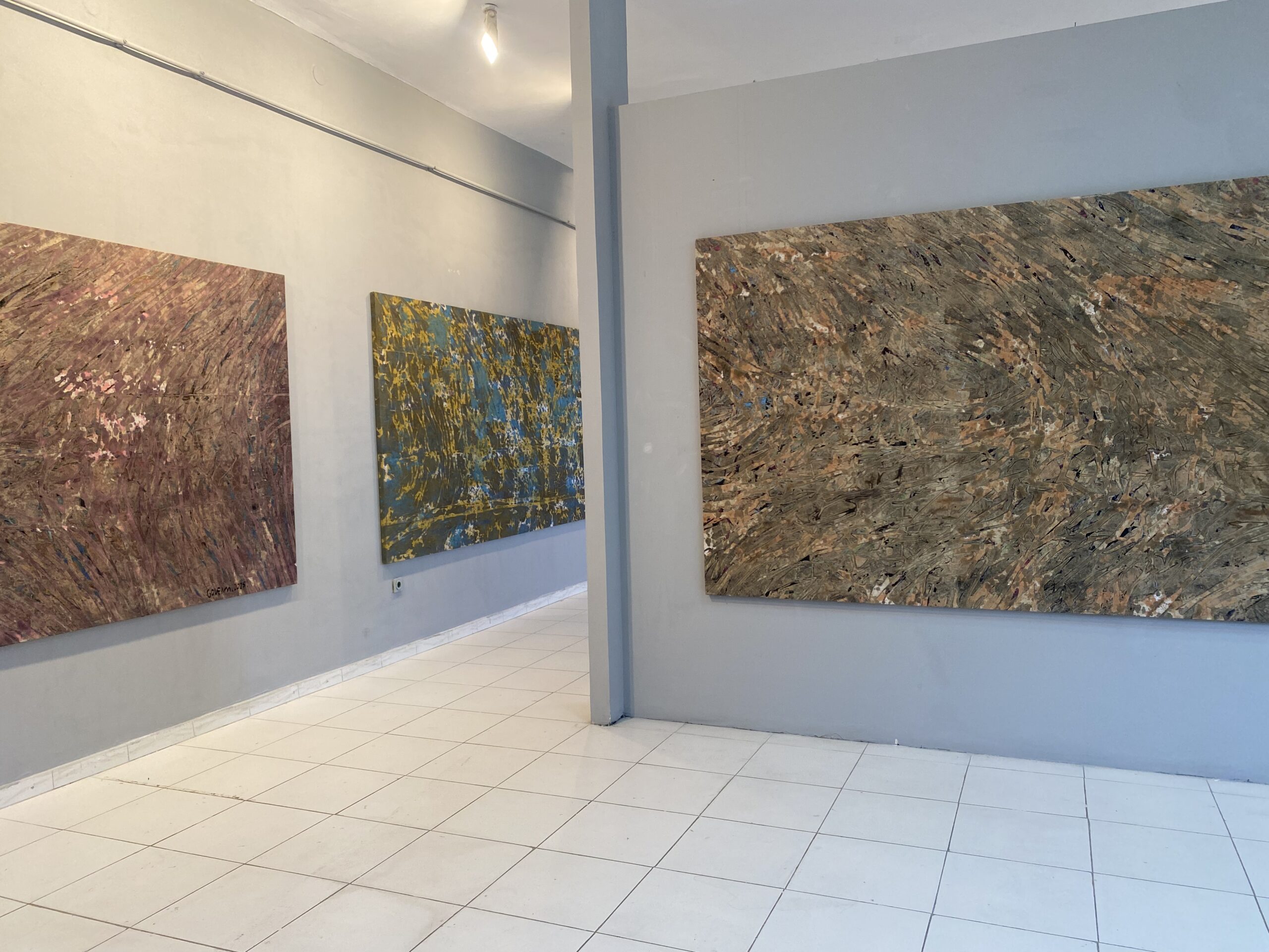 Hapësirat e galerisë janë mbushur me vepra të artistit, ku dominojnë kompozime me teksturë të theksuar dhe një gamë e pasur ngjyrash tokësore, blu dhe të kuqe. Një pjesë e punëve janë realizuar gjatë vitit të fundit, duke dëshmuar një vijimësi kërkimi mbi materialin dhe formën, si dhe një qasje të qëndrueshme ndaj abstraksionit.