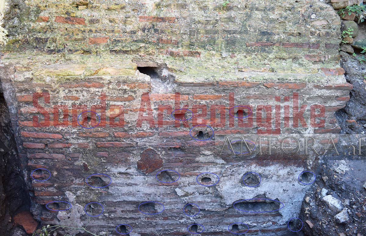 Vrimat që ne shohim në fasadën e murit, janë simetrike dhe në vijë horizontale, në të paktën 3 nivele të vona dyshemeje dhe ripërdorimi të hapësirës, që zgjat nga shekulli VII, deri në shekullin XIV, e që i identifikova përgjatë gërmimeve, mund të kenë shërbyer për vendosjen e trarëve të dyshemesë. Por kjo duhet studiuar me kujdes, pasi është i paqartë funksioni i tyre.